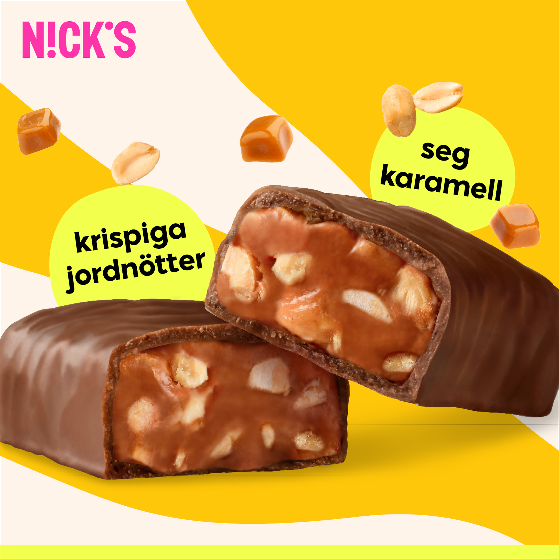 Saved peanut caramel protein bar has a peanut and chewy caramel flavor and is covered in milk chocolate. Made from 50% salvaged ingredients as part of a collaboration between Nick's and Matsmart to reduce food waste.
