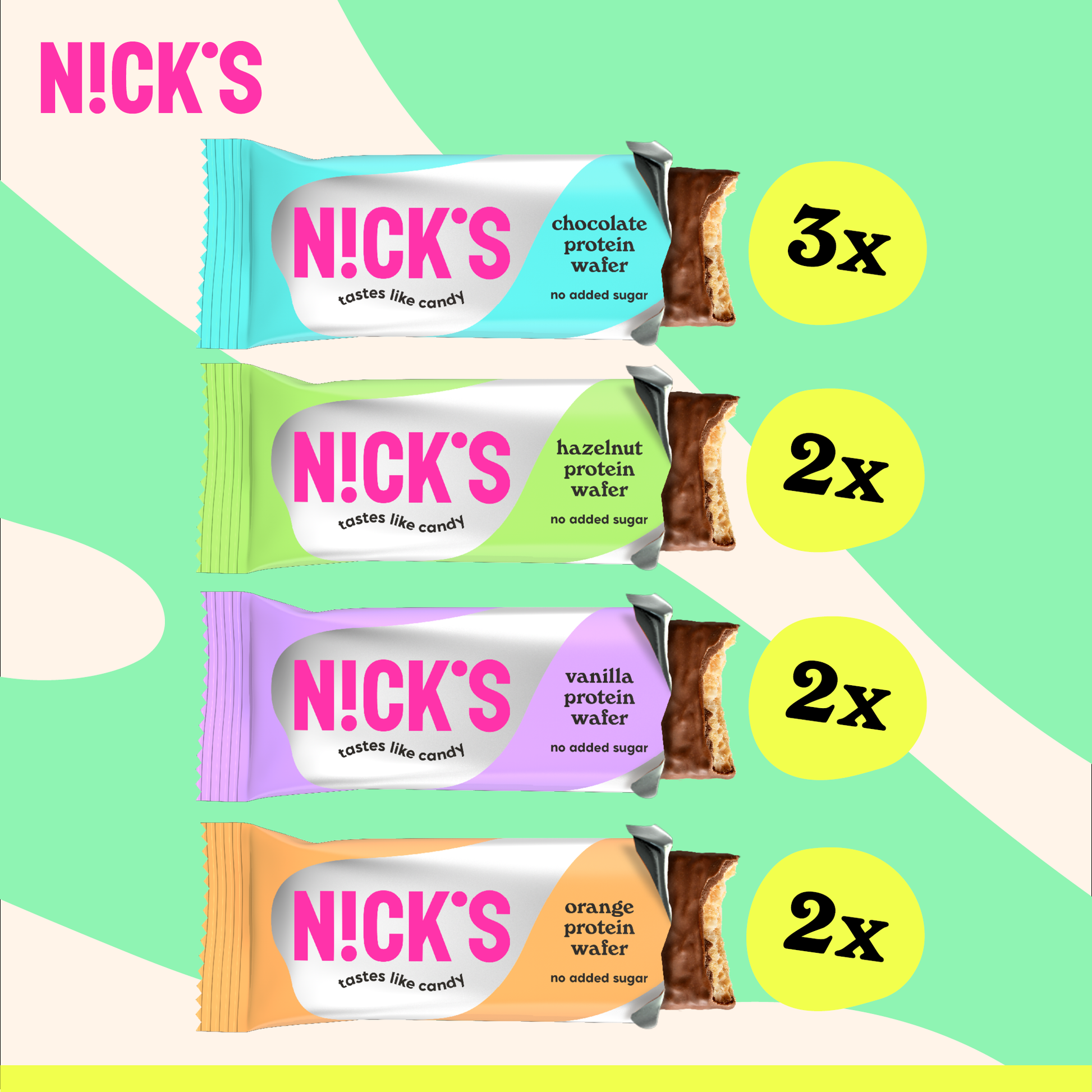 The box contains a mix of our Protein Wafers: 3 Protein Wafers Chocolate, 2 Protein Wafers Hazelnut, 2 Protein Wafers Vanilla and 2Protein wafer orange.