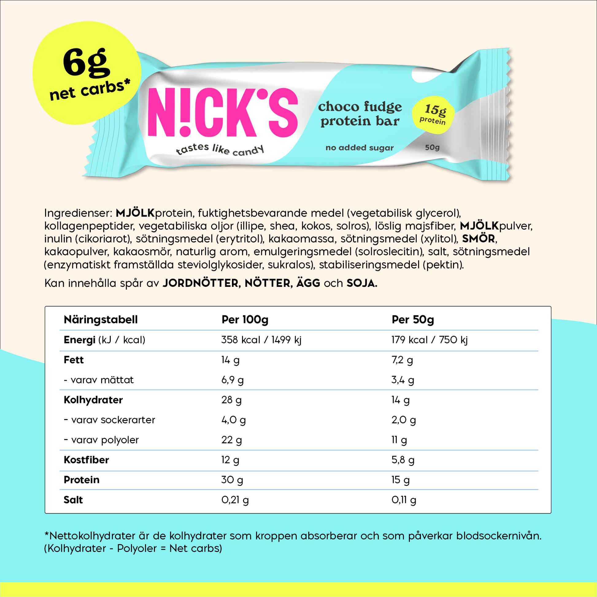 Milk/milk protein, humectant (vegetable glycerol), collagen peptides, vegetable oils (illipe, shea, coconut, sunflower), soluble corn fiber, milk/milk powder, inulin (chicory root), sweetener (erythritol), cocoa mass, sweetener (xylitol), butter, cocoa powder, cocoa butter, natural flavour, emulsifier (sunflower lecithin), salt, sweetener (enzymatically produced steviol glycosides, sucralose), stabilizer (pectin). May contain traces of peanuts/peanuts, tree nuts, eggs and soy