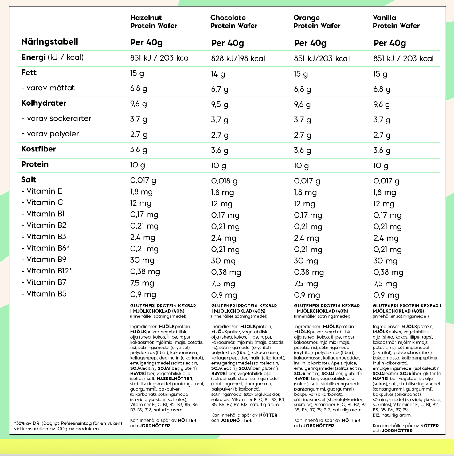 The box contains a mix of our Protein Wafers: 3 Protein Wafers Chocolate, 2 Protein Wafers Hazelnut, 2 Protein Wafers Vanilla and 2Protein wafer orange.